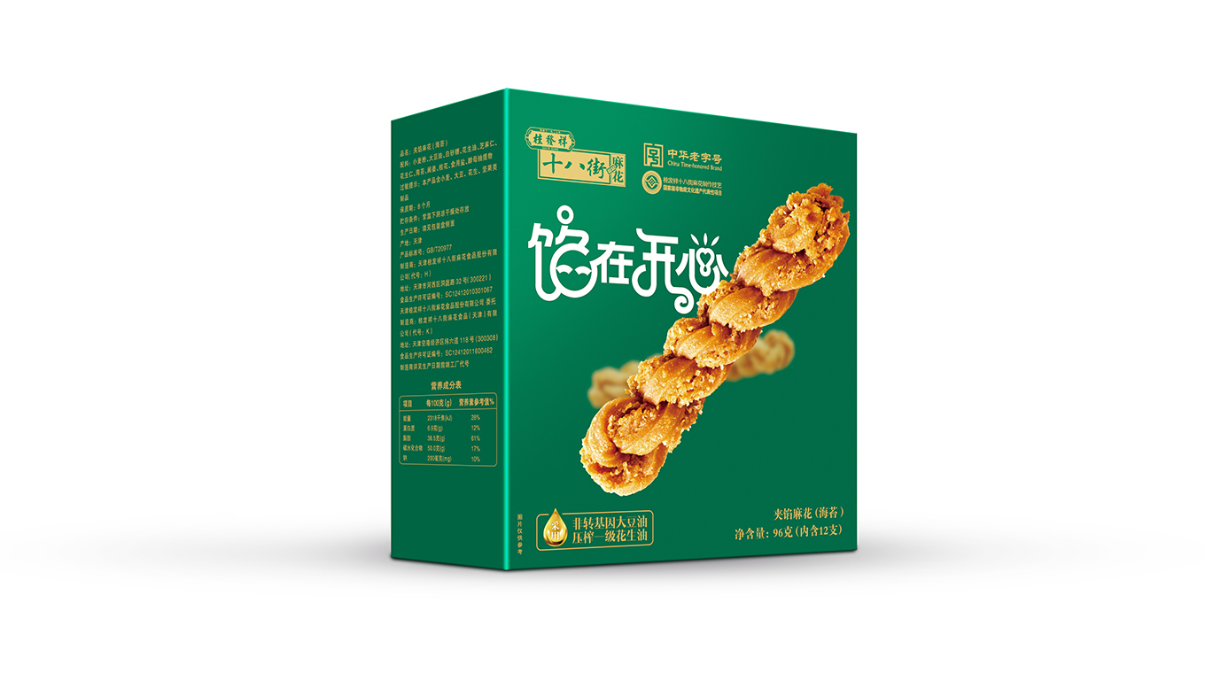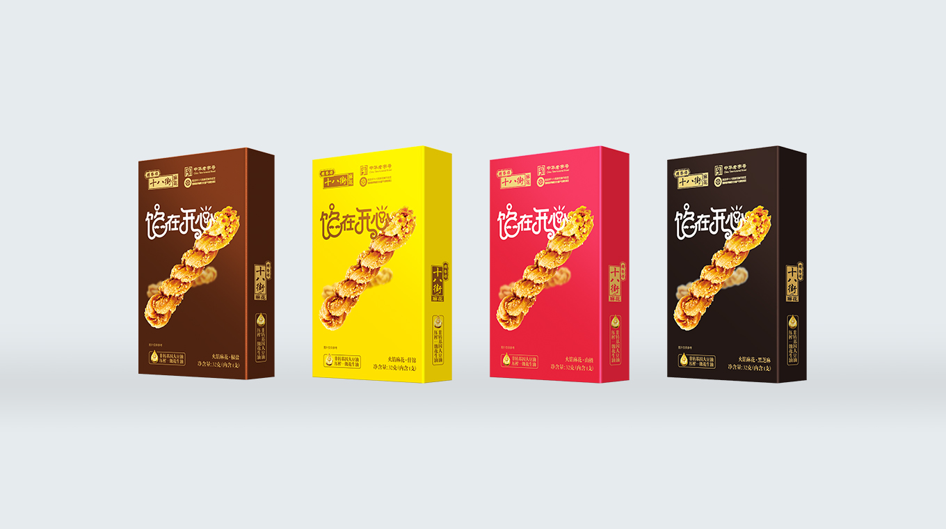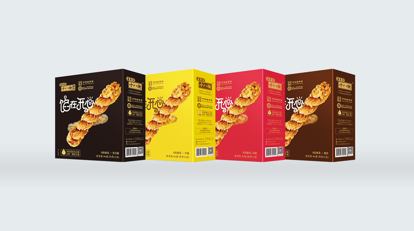 本次十八街夹馅麻花包装设计焕新升级,在设计上贴合年轻人喜好,精挑细选6种亮眼色彩,配合大幅产品展示,给消费者制造简单直接的记忆点,使其有过目难忘的魔力。文案设计上除了用可爱造型文字拉近与消费者的距离,更配合时下流行的谐音梗“馅在开心”,寓意消费者尝过此款桂发祥“夹馅”小麻花后一定有好心情有如陷在开心中难以自拔,更会陷在美味中久久回味。总的说来,整体包装设计跳脱大胆,话题性十足,以小见大展现了天津老字号桂发祥品牌敏锐把握年轻消费者喜欢,敏锐洞察最新潮流,不恋过往、敢于自我革新的勇气,以新包装为载体展示传播了天津美食和天津文化。