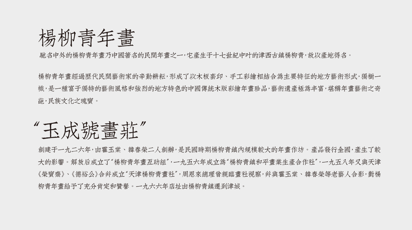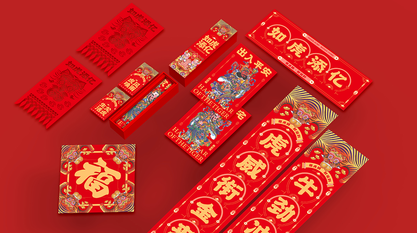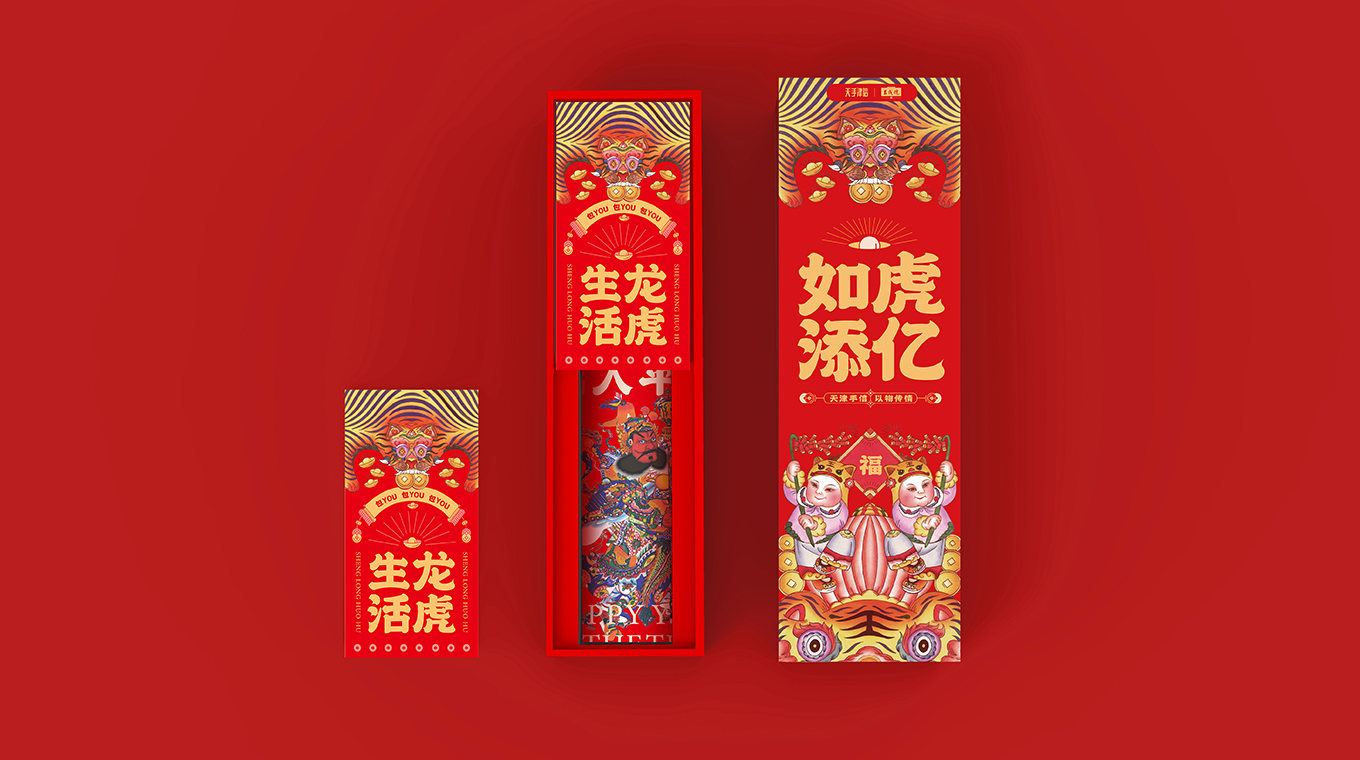 2022年天津手信携手国家级非物质文化遗产项目杨柳青木版年画代表性传承人霍庆顺先生的玉成号画庄联合推出虎年贺岁如虎添亿礼盒,将杨柳青年画与春节贴年红习俗结合,提取杨柳青年画中“童子、虎纹、门神”等图纹,用时下年轻人喜欢的国潮设计风格呈现,上演一场传统与潮流的碰撞,向传统手艺人致敬,也表达对新年、新春和新生活的美好期盼。