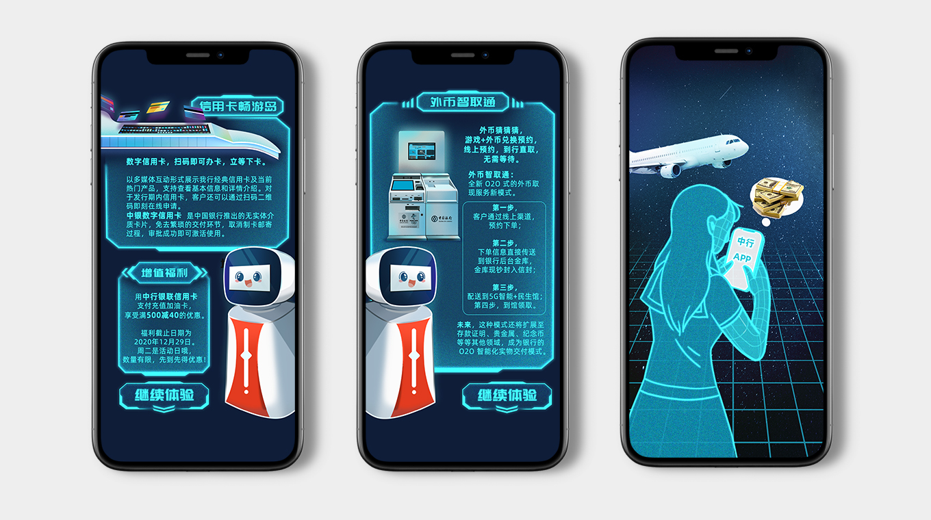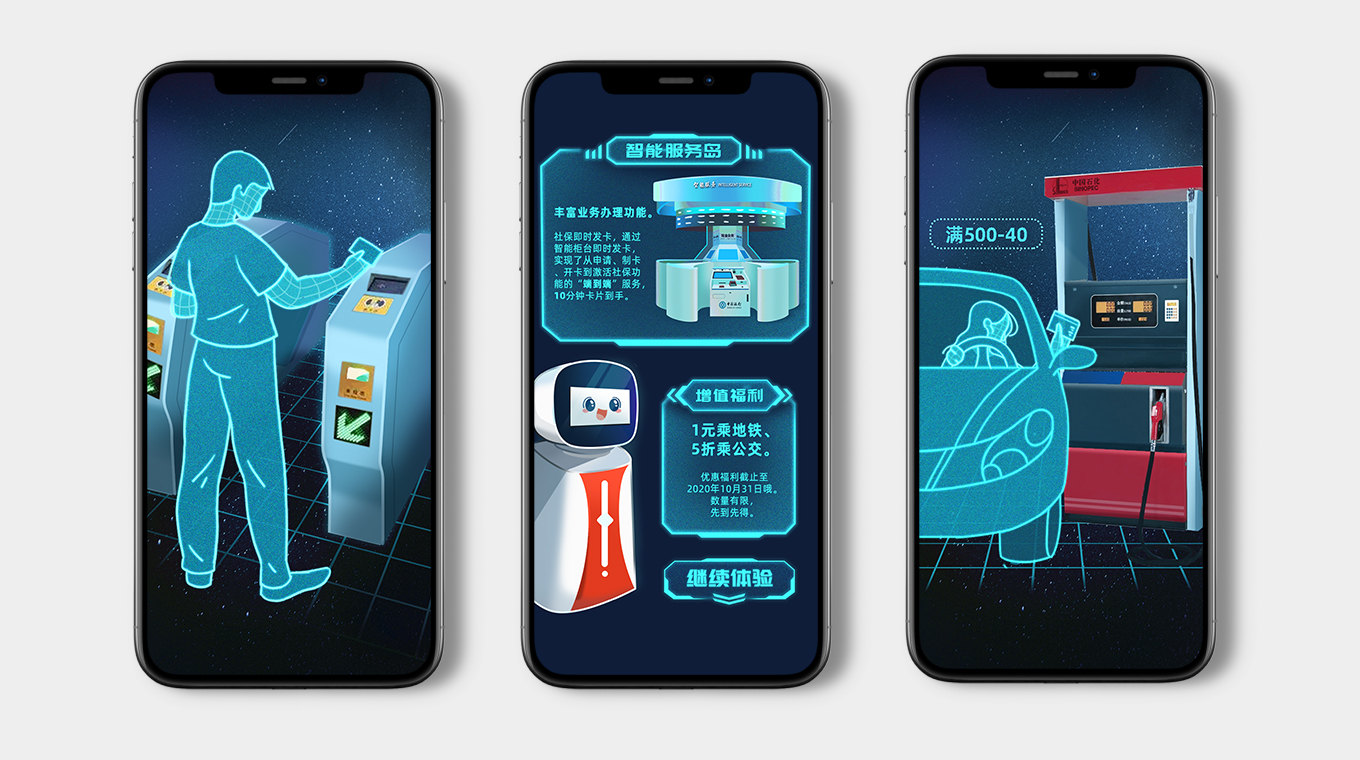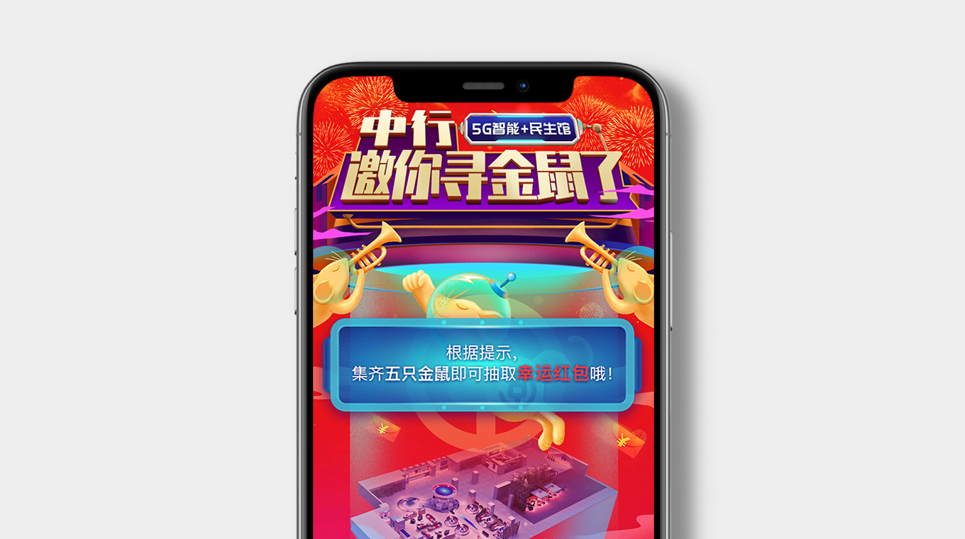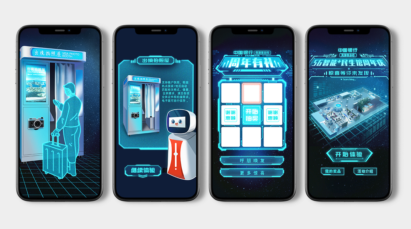 中行5G智能+民生馆是天津市场第一家5G智慧网点,以“金融服务民生”为主题,融入高科技智能化设计,真正为老百姓提供高品质金融服务。采用环境建模技术还原5G馆现场环境,搭建5G运营场景,通过H5交互答题展示5G运用的模型动画,让用户沉浸式体验金融服务的不同模块。通过朋友圈创意广告向大众展现中行科技创新能力、吸引用户关注体验、彰显中国银行普惠民生的企业形象。