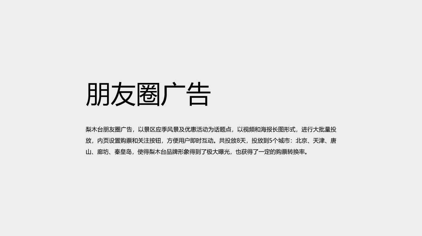 2011年,针对梨木台景区存在的品牌定位模糊、没有统一核心诉求、差异化竞争力薄弱等问题,进行梳理分析,充分发掘景区特质,建立品牌定位,提炼出slogan“世外山水画,传奇梨木台”,延展出“封存千年的传奇风景”这一主推广语,凝结出“七大传奇”的核心价值点。优化升级logo,围绕封存概念,进行主形象创意设计。后期围绕品牌定位,制定了一系列战略规划,进行地缘式立体营销推广,使梨木台在京津冀地区旅游市场形成了独特的竞争优势,从一个缺乏差异化特色的观光景点蜕变成为定位精准、产品特征显著的文化特色景区,游客数量持续攀升,实现华丽变身。