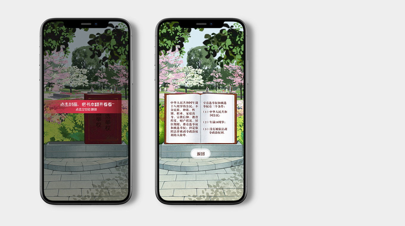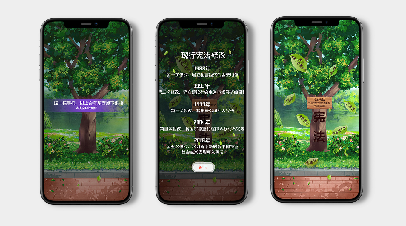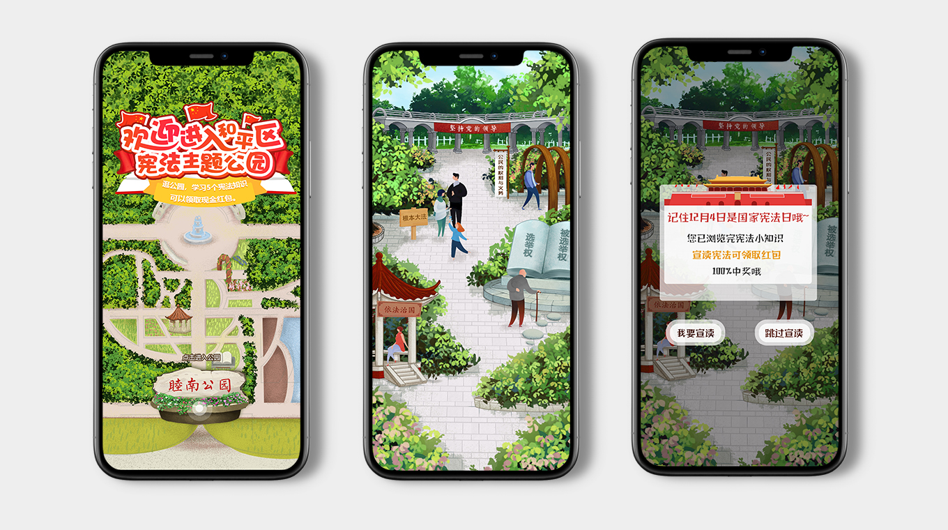 配合国家宪法日宣传,为和平区司法局定制开发“宪法主题公园”H5互动游戏。手绘和平睦南公园实景图作为游戏页面背景,以游戏参与者视角游览公园各个场景点位,每个点位设置游戏关卡,以互动答题形式展示五个宪法知识并设置在线宣誓、分享抽红包等游戏环节,让更多用户参与和转发,达到宣传宪法的目的。