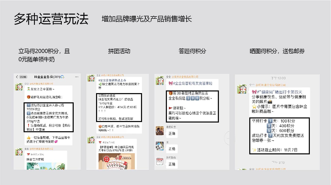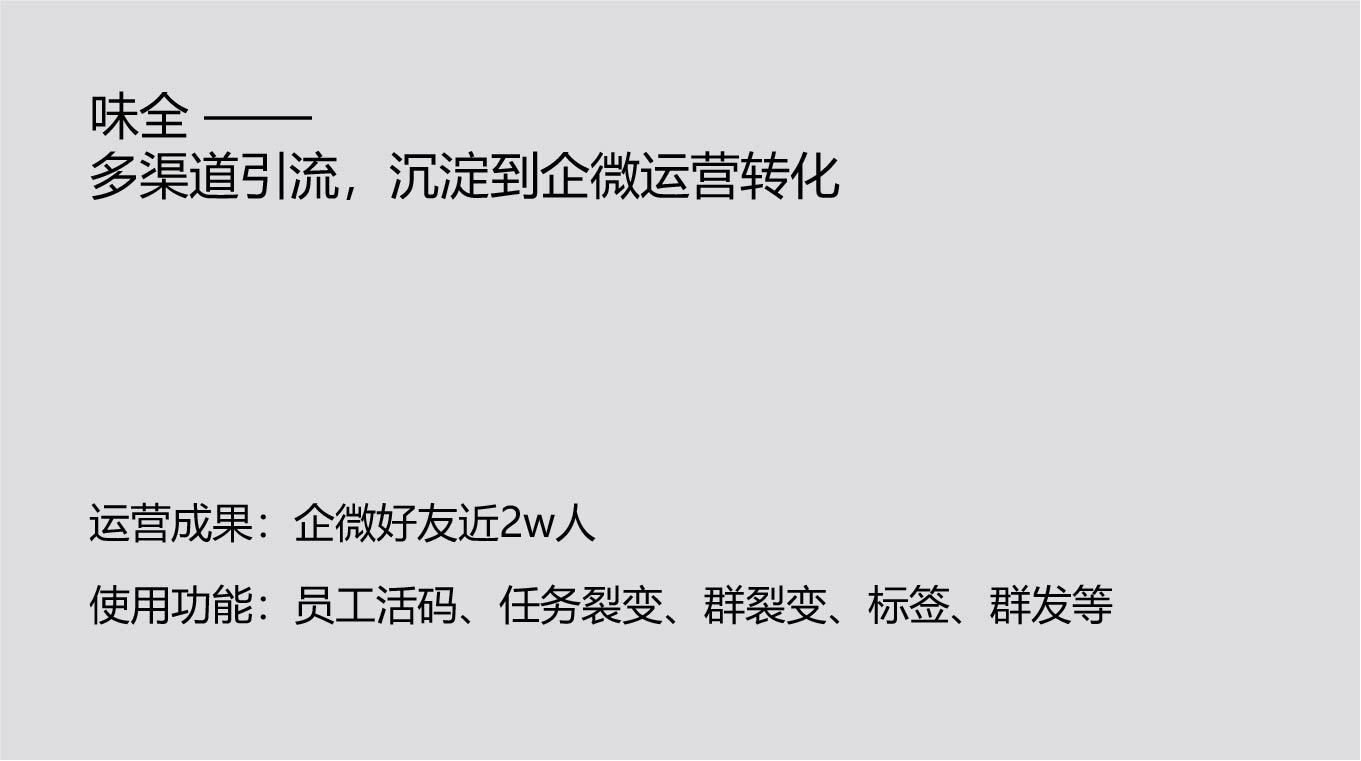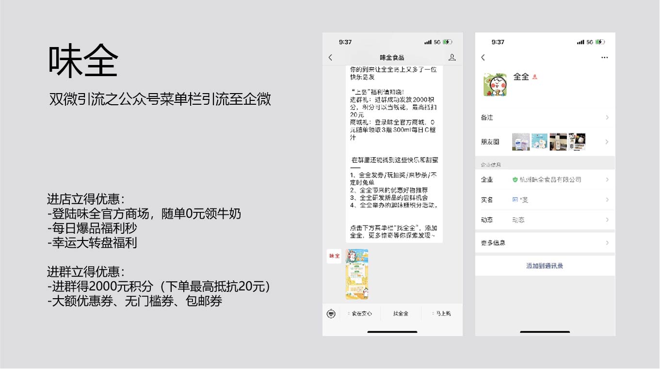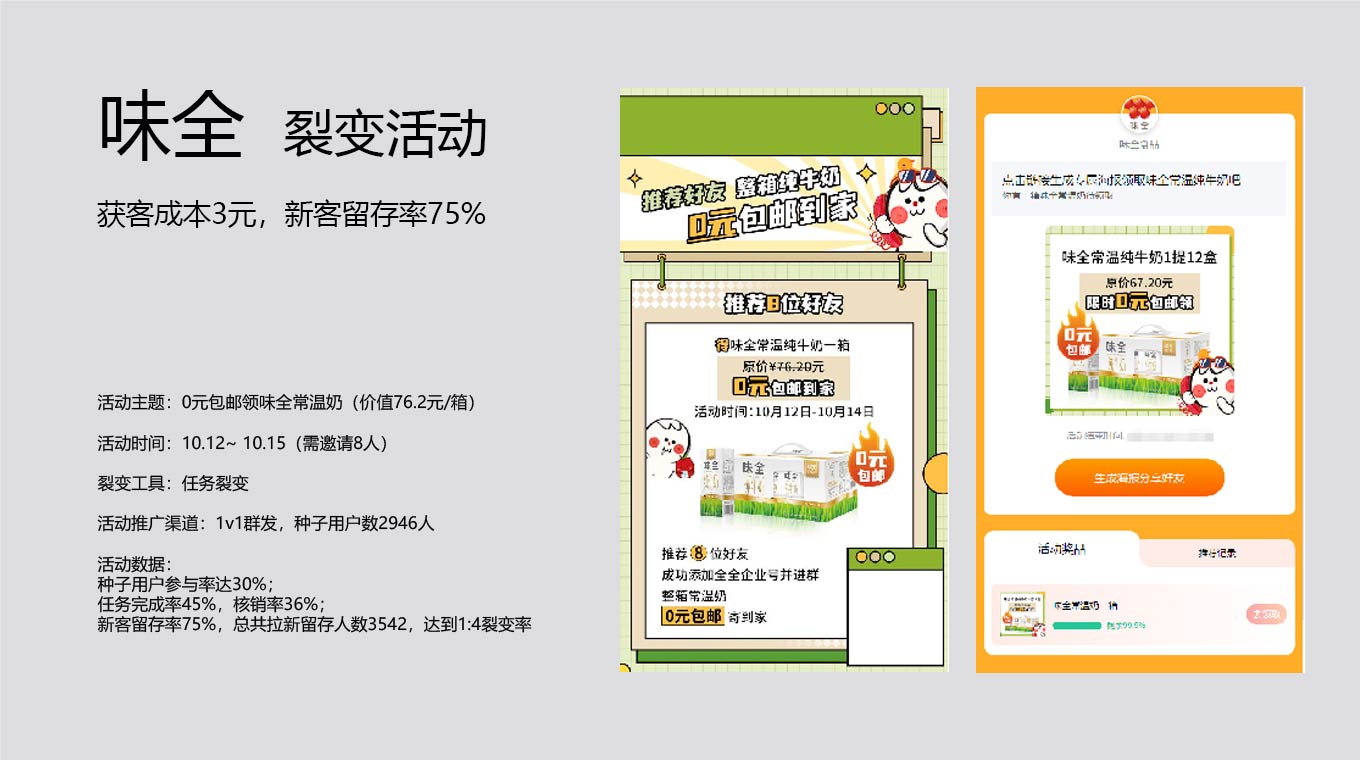 味全通过集中化运营,配合企微管家+小程序,实现用户拉新、留存、转化和裂变来实现私域流量的闭环链路打通。使用过程中打造客服人设全全,后期通过先铺包裹卡、双微线上渠道加好友再引导注册会员及进群。对新关注用户,进行注册商城会员得2000积分(100积分为1元)、答题得积分、晒单得积分、0元随单礼、打卡、抽奖等营销活动进行留存,并开展系列裂变营销活动,裂变新客留存率高达75%,达到1:4裂变率。从而最终达到增加企微好友近2w人的效果。