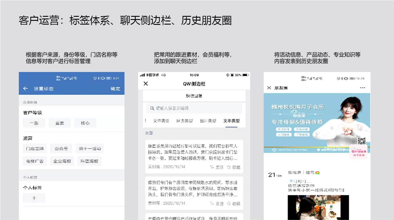 悦悦满母婴在赣州开创酒店式月子会所先河,倾力为准妈妈打造轻奢私密的月子享受,想通过企业微信沉淀自己的私域用户池,后续打造极致运营服务。通过多个员工活码,添加企微好友400+,并通过标签功能对客户进行了详细的分门别类,有助于对客户运营服务质量的提升。