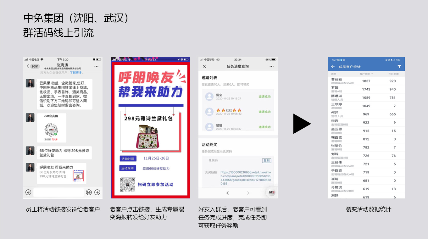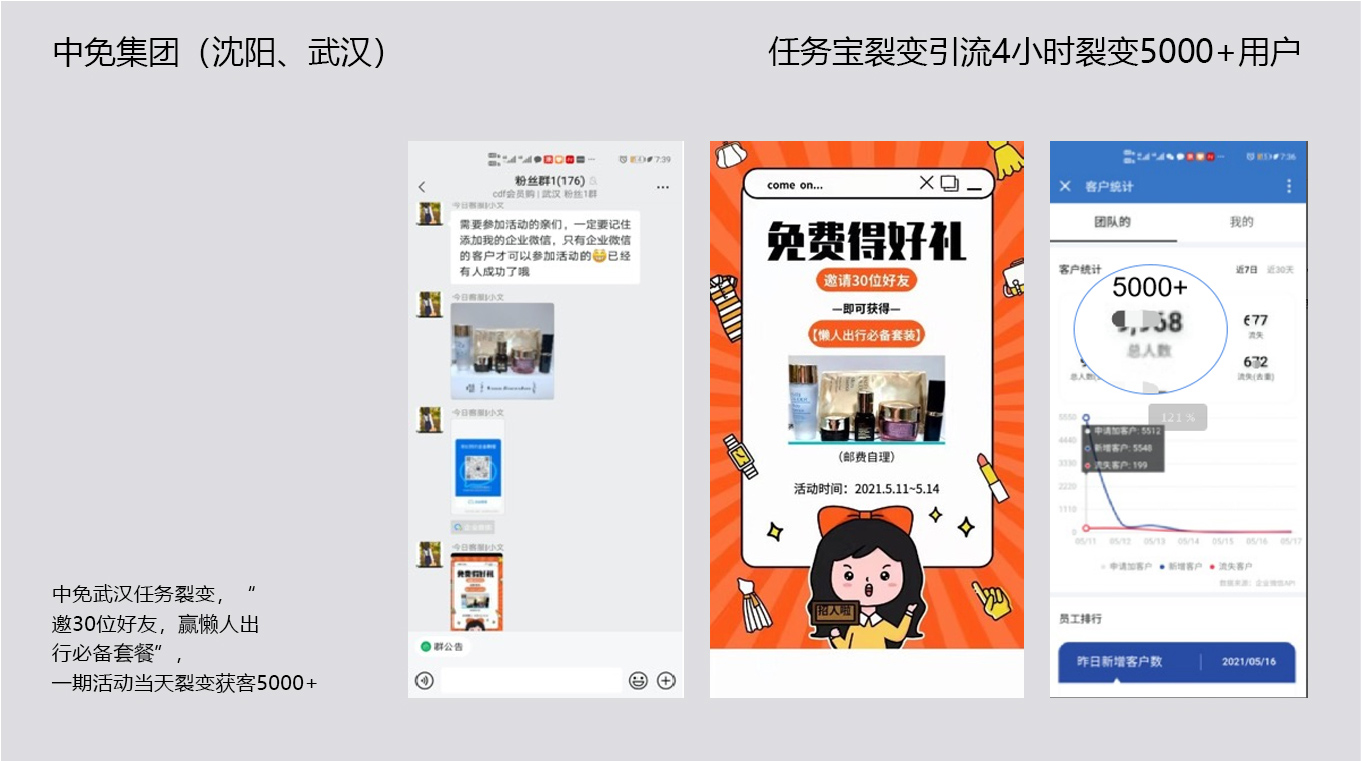 内容 通过使用群活码、任务宝裂变、个性欢迎语、客户朋友圈、客户群等功能,两个月内新增客户10W+,社群100+