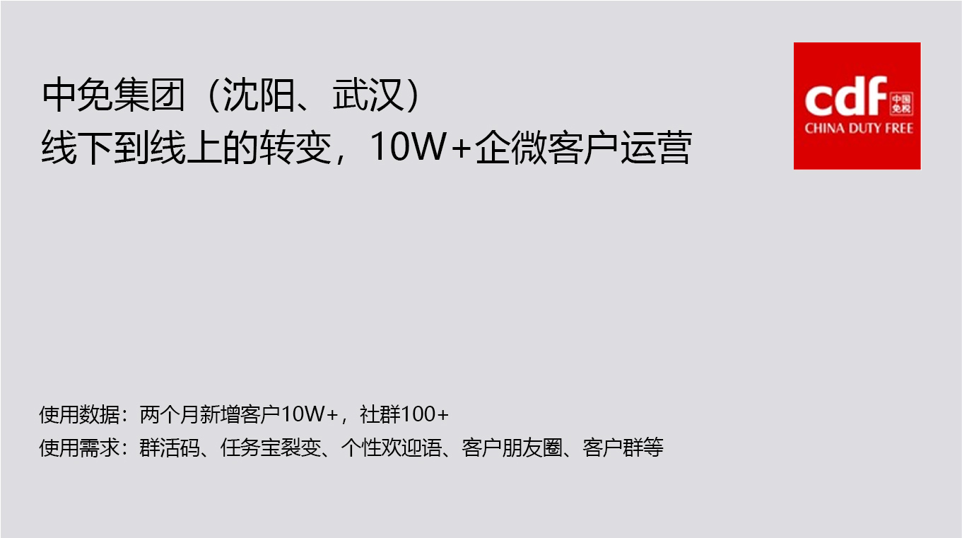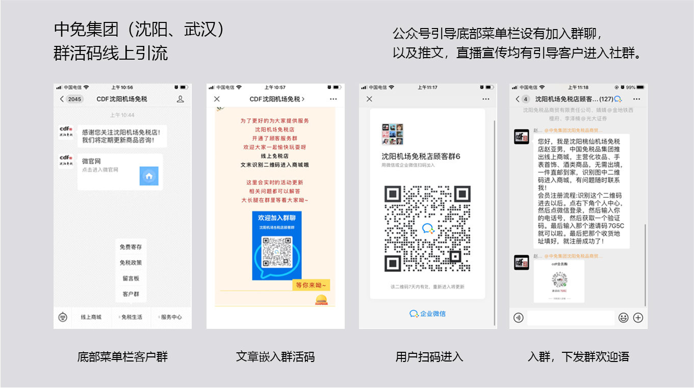 中免集团通过使用企微管家渠道活码、任务宝裂变等方式进行线上各渠道拉新引流,并在社群内通过直播、免税商品推荐等方式进行营销转化,最终完成线下到线上的销售模式转变,两个月客户沉淀企微客户10W+,社群100+。
