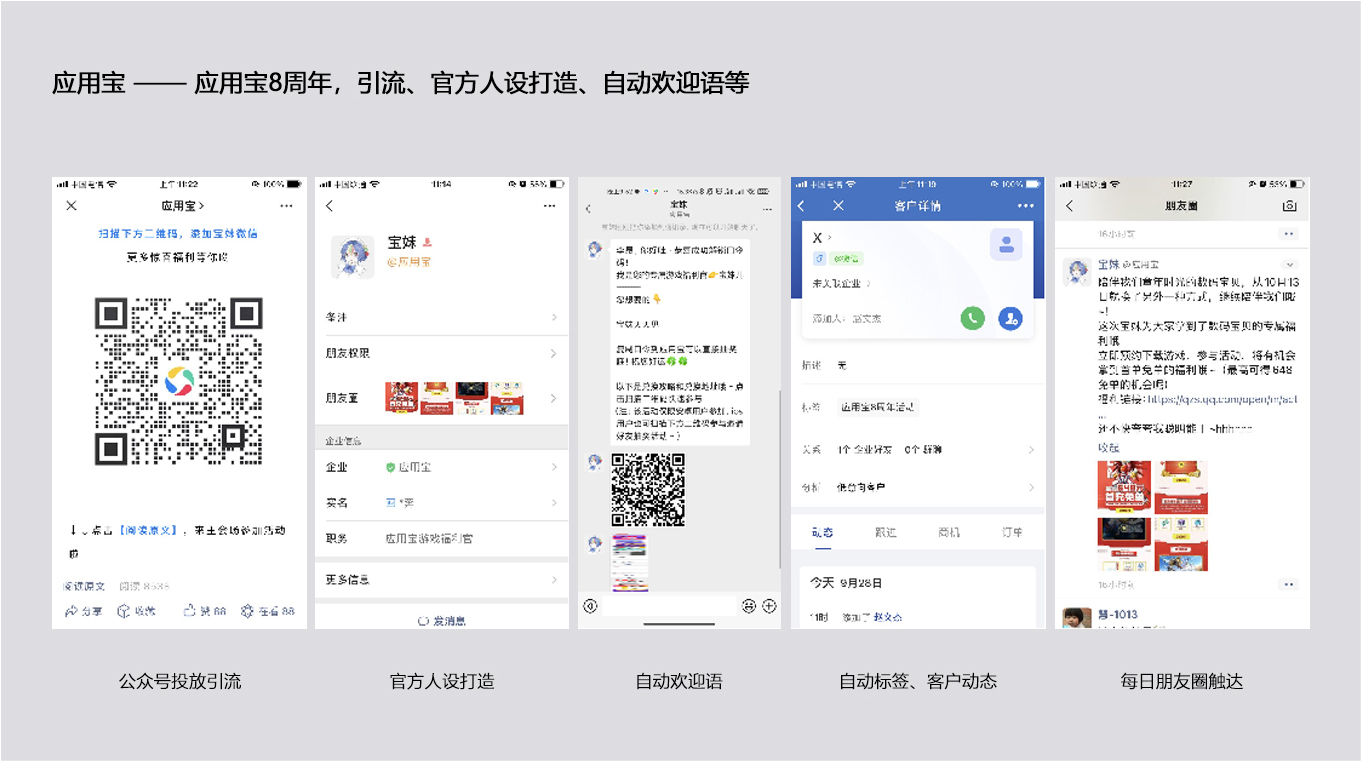 以应用宝8周年庆为契机,将部分线上线下渠道高价值游戏用户通过企业微信好友的方式进行活动沉淀,后续通过客户分层,来进行以游戏等为维度的用户精准运营。实操过程中借助企微管家进行了产品+运营咨询服务合作,梳理线上线下渠道情况,通过企微管家渠道活码,高效获客,用户通过个性欢迎语直接参与活动;另外,通过“加好友得Q币”的任务裂变活动,达到单日新增企微好友3000+的效果。