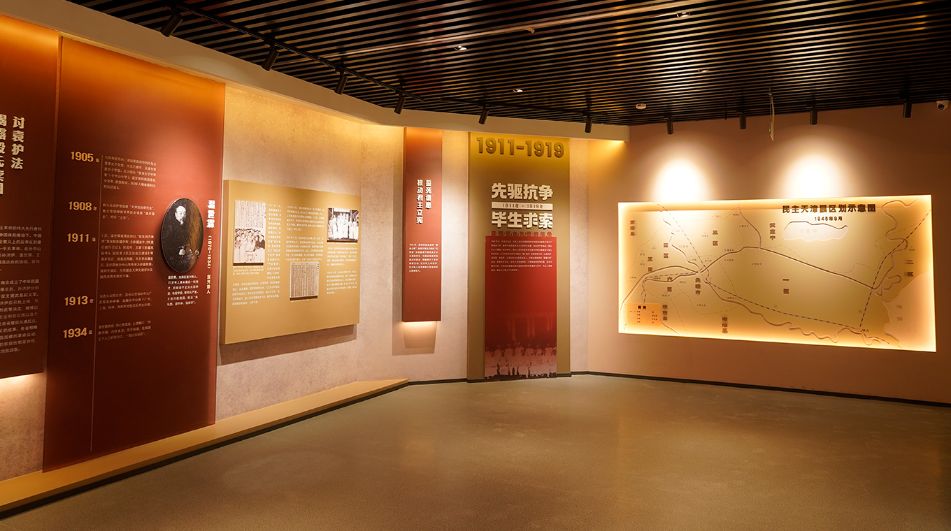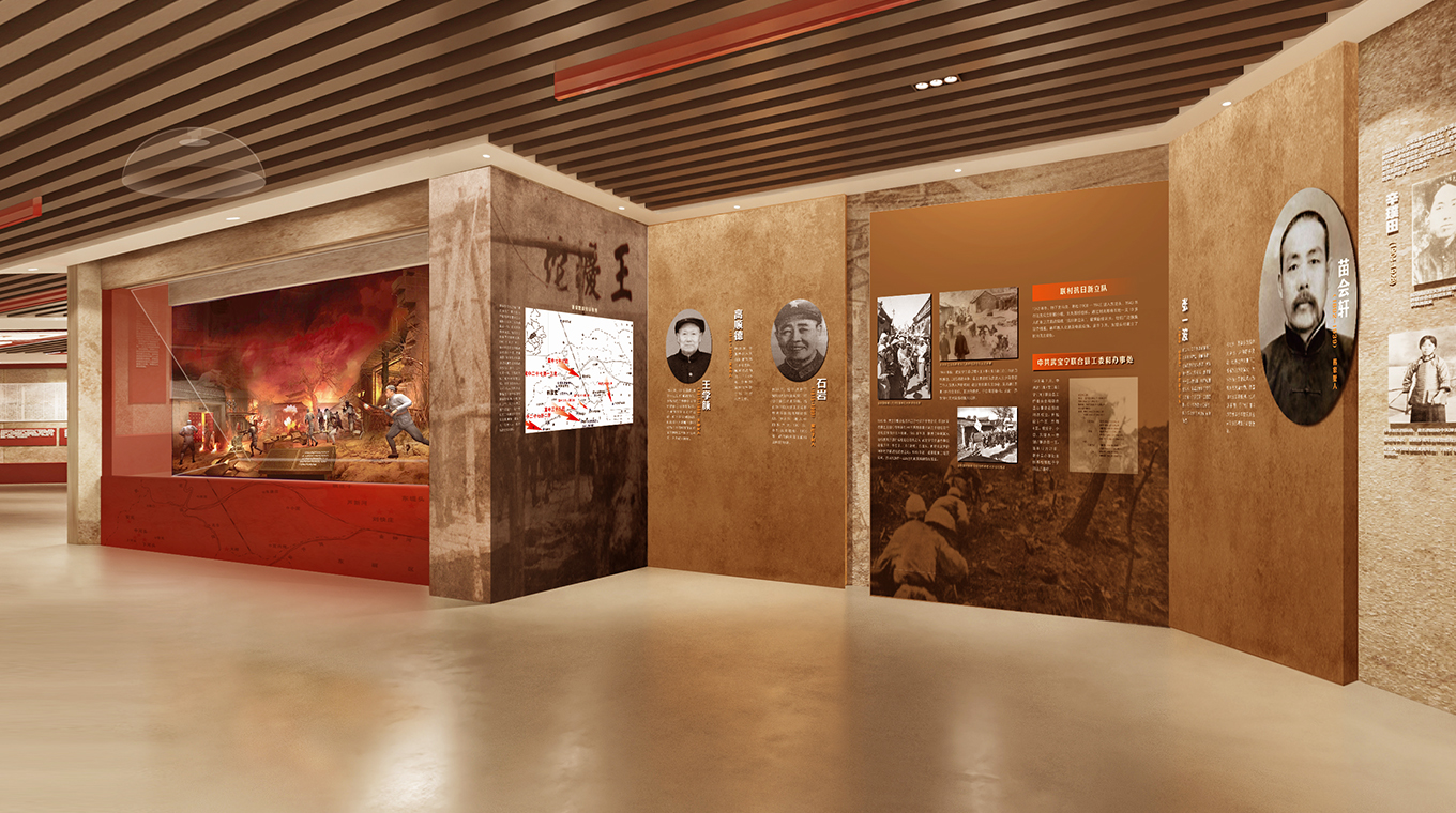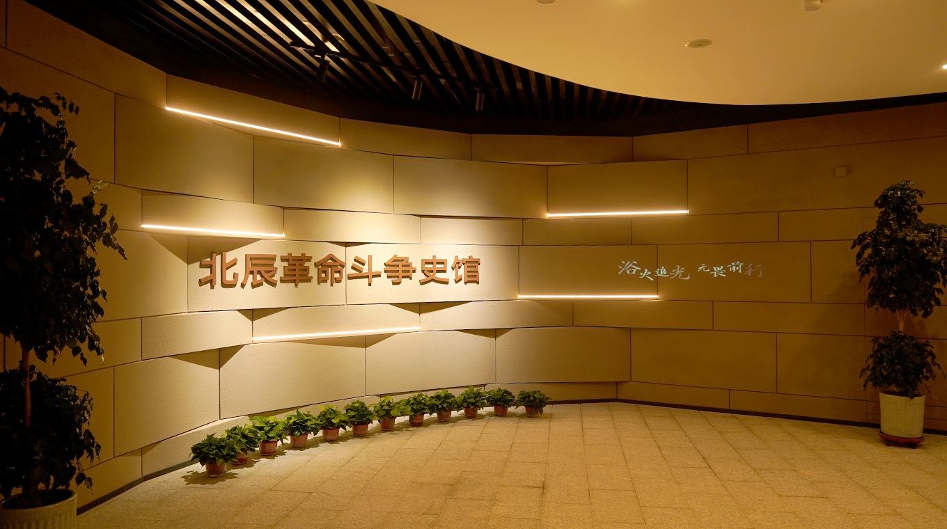 北辰革命斗争史馆由序厅、主展厅组成。序厅兼具参观氛围营造功能以及观众集散功能。主展厅以时间为主线,分为五大展区展现北辰革命斗争史,在设计与空间分布上采用场景还原、图文结合、文物展柜及互联灯光、音效、视觉融合等多种展现方式,同时运用数字技术提升体验与服务,充分展示北辰红色文化,传承红色基因。
