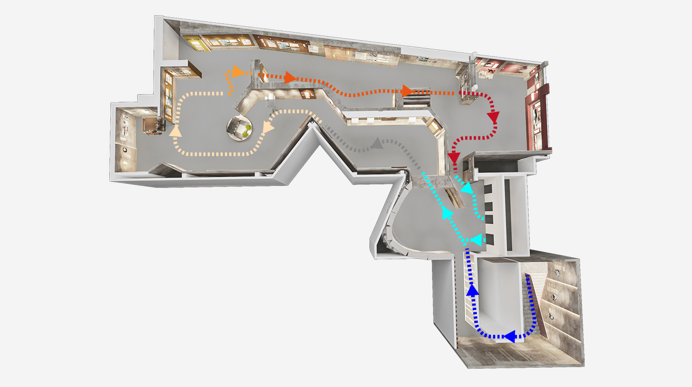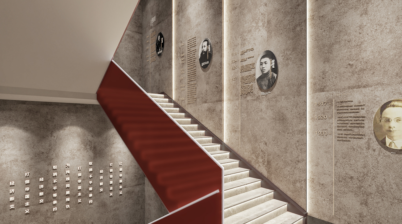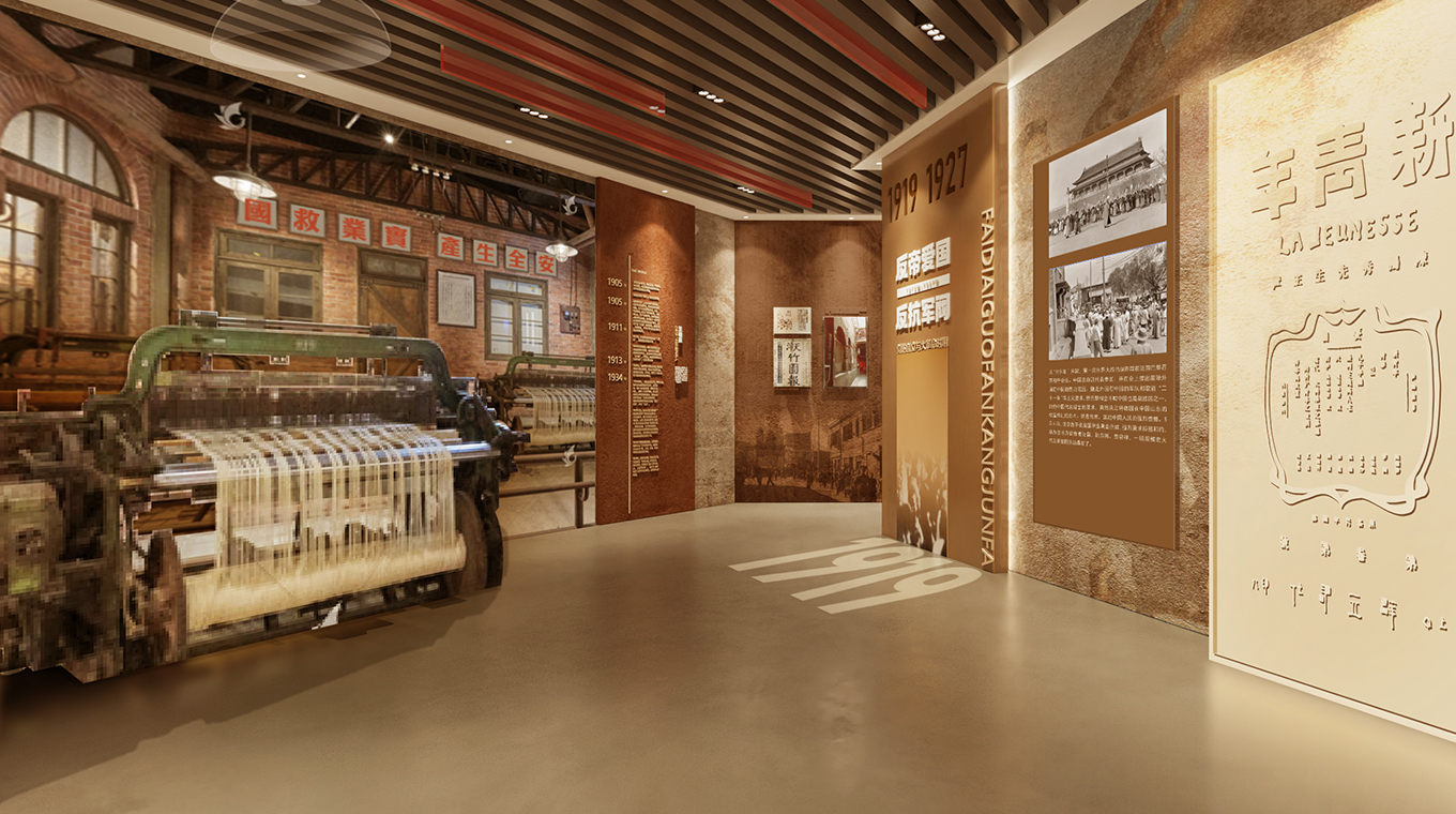 北辰革命斗争史馆由序厅、主展厅组成。序厅兼具参观氛围营造功能以及观众集散功能。主展厅以时间为主线,分为五大展区展现北辰革命斗争史,在设计与空间分布上采用场景还原、图文结合、文物展柜及互联灯光、音效、视觉融合等多种展现方式,同时运用数字技术提升体验与服务,充分展示北辰红色文化,传承红色基因。